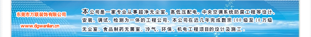 东莞市万联装饰有限公司成立于1989年。本公司是一家专业从事超净无尘室、高低压配电、中央空调系统防腐工程等设计、安装、调试、检测为一体的工程公司、本公司在近几年完成数宗100级至10..
